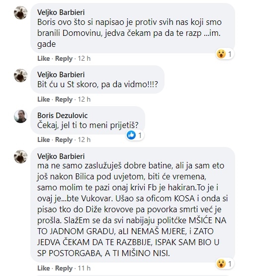 “Boris ovo što si napisao je protiv svih nas koji smo branili Domovinu, jedva čekam pa da te razp …im. gade. Bit ću u St skoro, pa da vidmo!!!?”, piše Barbieri, na što ga Dežulović pita; “Čekaj, jel ti to meni prijetiš?”