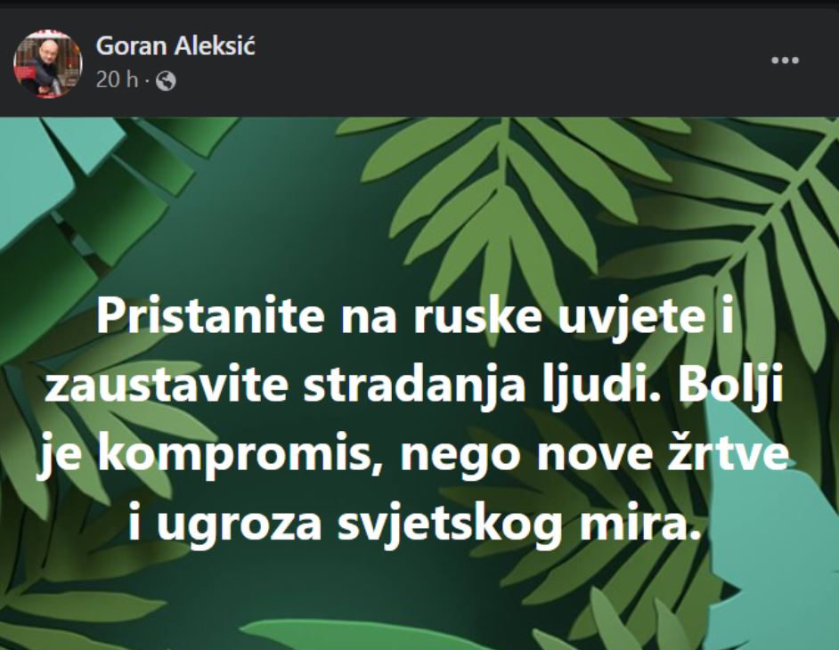 “Pristanite na ruske uvjete i zaustavite stradanja ljudi. Bolji je kompromis, nego nove žrtve i ugroza svjetskog mira”, napisao je Aleksić u ponedjeljak.