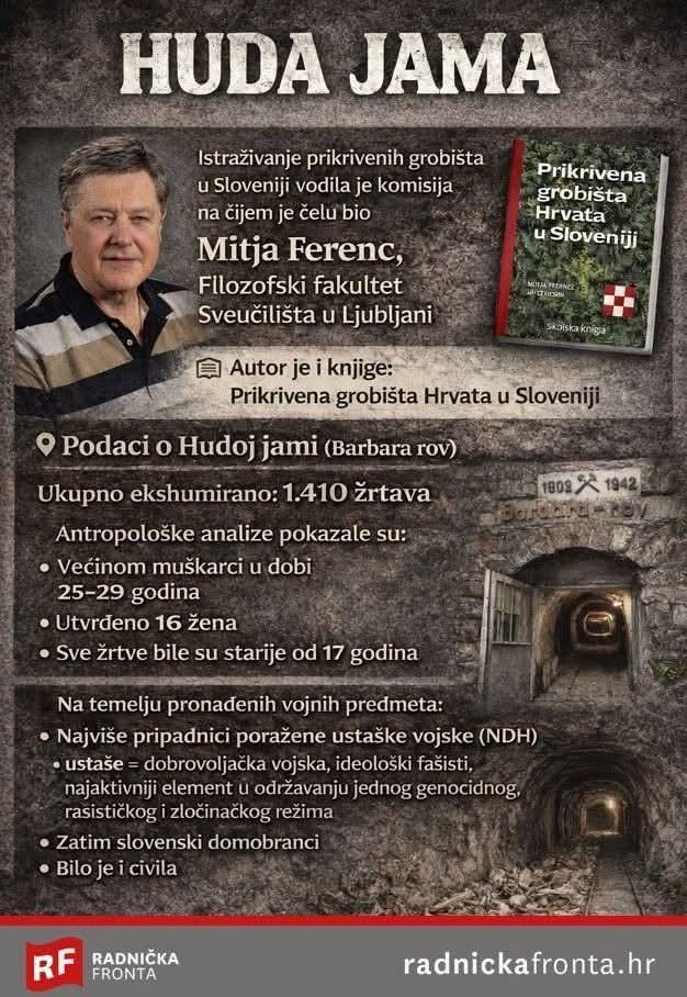 “Radnička fronta ponavlja svoju objavu od prije nekoliko godina, koja je u međuvremenu dodatno aktualizirana prijevodom radova Mitje Ferenca na hrvatski jezik. Posebno ističemo kako je knjiga prilično manipulativno predstavljena već samim naslovom “Prikrivena grobišta Hrvata u Sloveniji” jer takva formulacija sugerira nacionalnu pripadnost kao ključnu kategoriju stradanja. Time se briše činjenica da se u tim grobištima ne nalaze “Hrvati” kao narod, nego pripadnici poraženih fašističkih i kolaboracionističkih formacija te osobe povezane sa zločinačkim režimom.