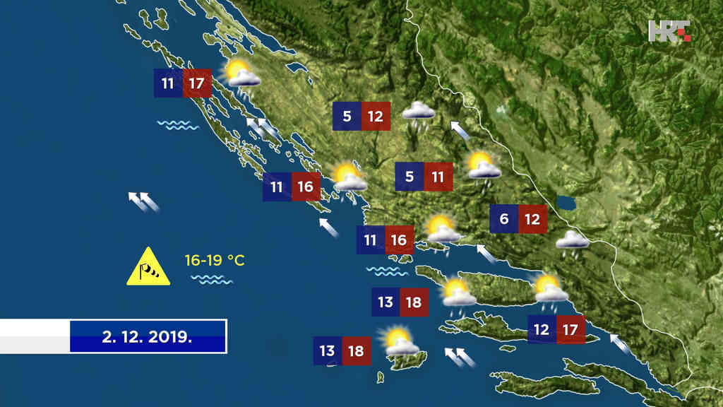 Podjednaka će temperatura zraka biti i na jugu Hrvatske, uz promjenljivo vrijeme s kišom, pa i pljuskovima s grmljavinom. Puhat će umjereno i jako jugo.”