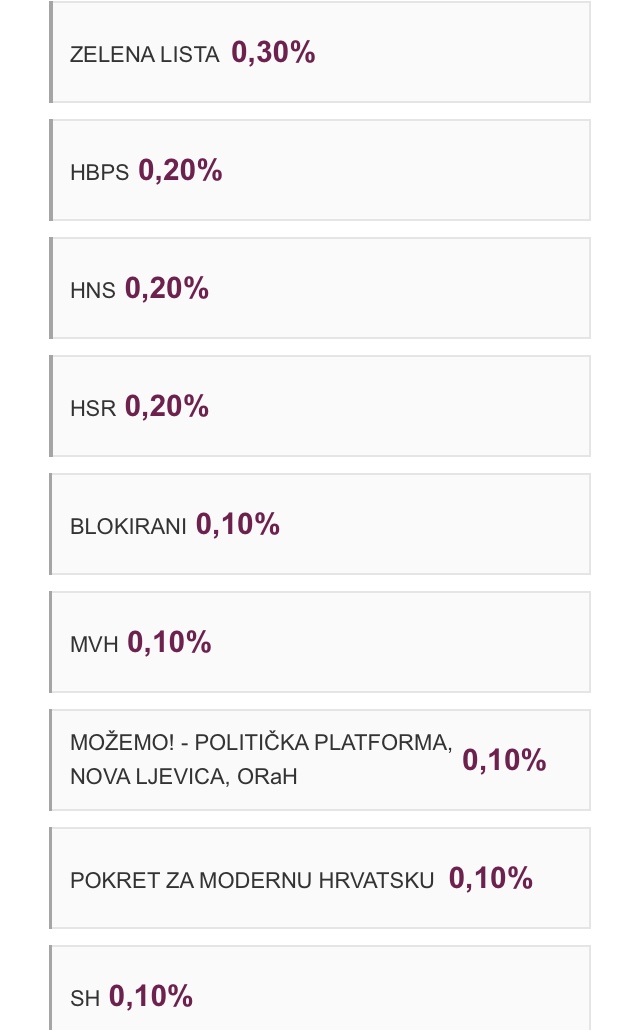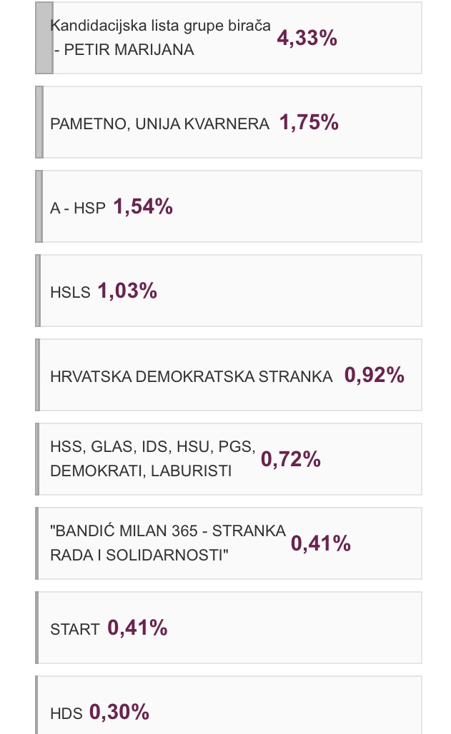 Ispod praga 5% vodi lista Marijane Petir (42), zatim slijedi Pametno (17), A-HSP (15), HSLS (10), HDS (demokratska) (9), Amsterdamska koalicija (7), jednaki broj glasova imaju stranka Bandić Milan 365 i START (4), HDS (demokršćanska) i Zeleni imaju po 3 glasa, HBPS ima 2 glasa koliko i HNS te HSR, a po 1 glas osvojili su Blokirani, MVH (Moja voljena Hrvatska), Možemo!, Pokret za modernu Hrvatsku, SH, te na koncu SHZ.