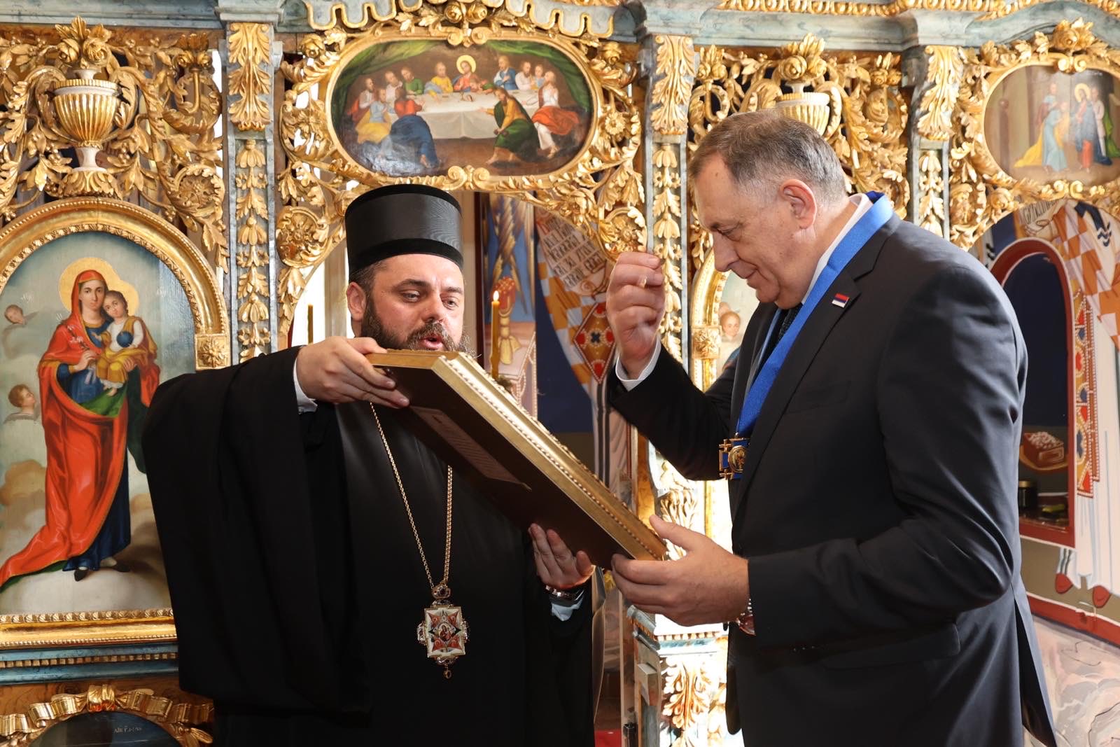 Milorad Dodik je danas posjetio Saborni hram Svetog velikomučenika Dimitrija u Dalju, gdje mu je uručen Orden Svetog Stefana Štiljanovića, najviše odlikovanje Eparhije osječko-poljske i baranjske.