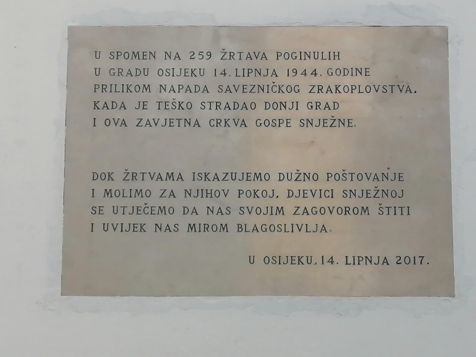 Sveta zadušnica u čast 259 Osječana poginulih u savezničkom bombardiranju Osijeka 16. lipnja 1944. održana je u ponedjeljak ujutro u kapelici Gospe Snježne u Donjem gradu. Euharistijski je obred predvodio donjogradski župnik, prečasni Ivan Jurić, župnik Župe Preslavna Imena Marijina, nakon čega su zapaljene svijeće ispod spomen-ploče postavljene na vanjskom zapadnom zidu crkve prije pet godina.