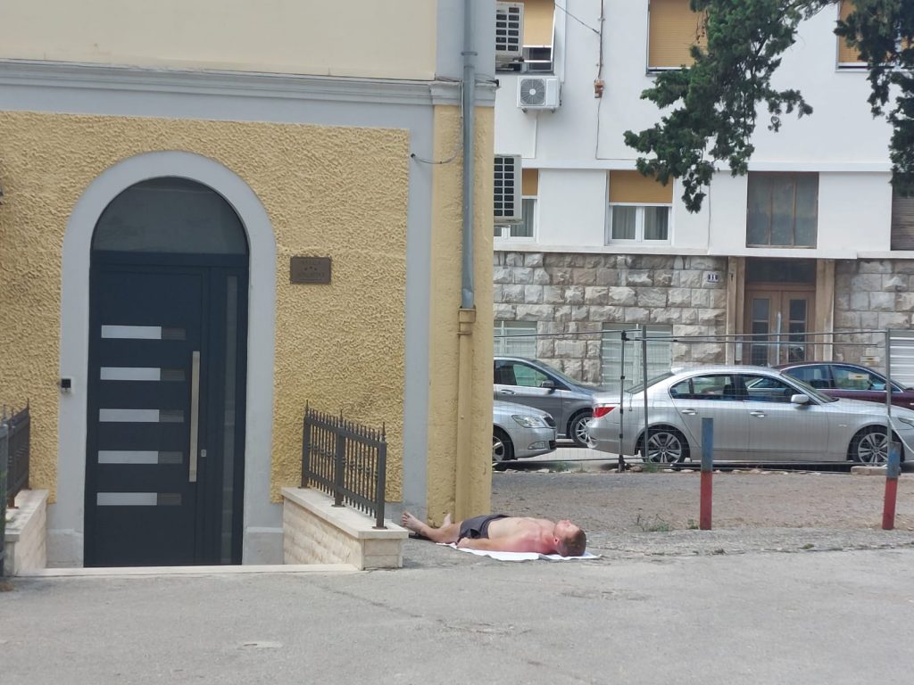 U središtu Splita nepoznati turist, po svemu sudeći stranac je postavio prostirku, sunča se i ‘hvata boju’.