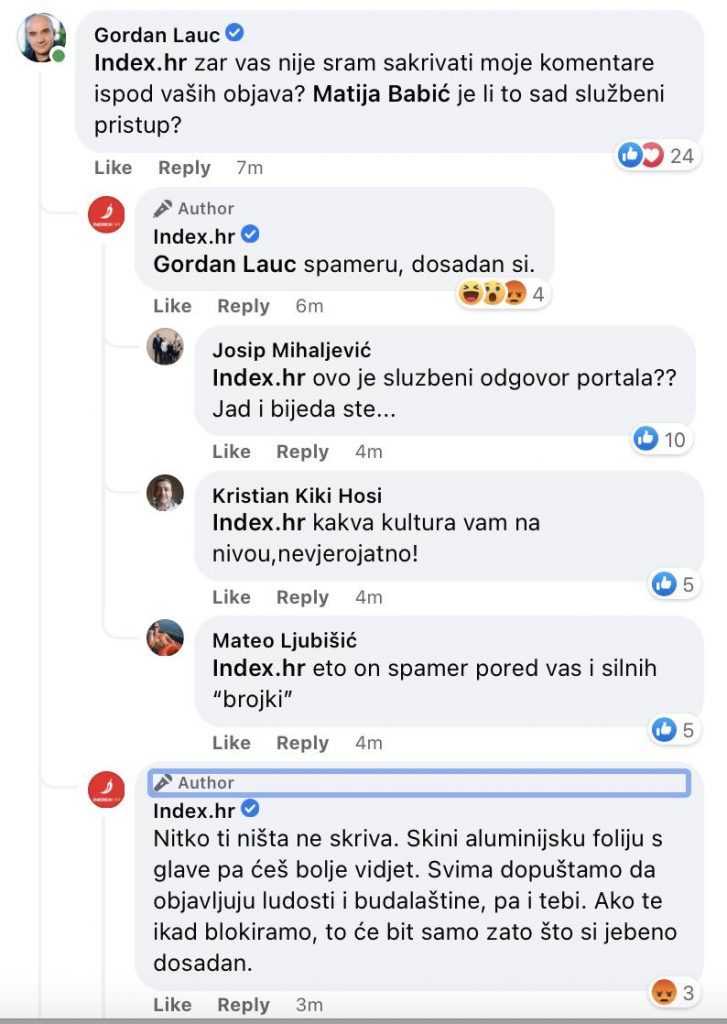 “Nitko ništa ne skriva. Skini aluminijsku foliju s glave pa ćeš bolje vidjeti. Svima dopuštamo da objavljuju ludosti i budalaštine, pa i tebi. Ako te ikad blokiramo, to će biti samo zato što si j….o dosadan”, piše Index.