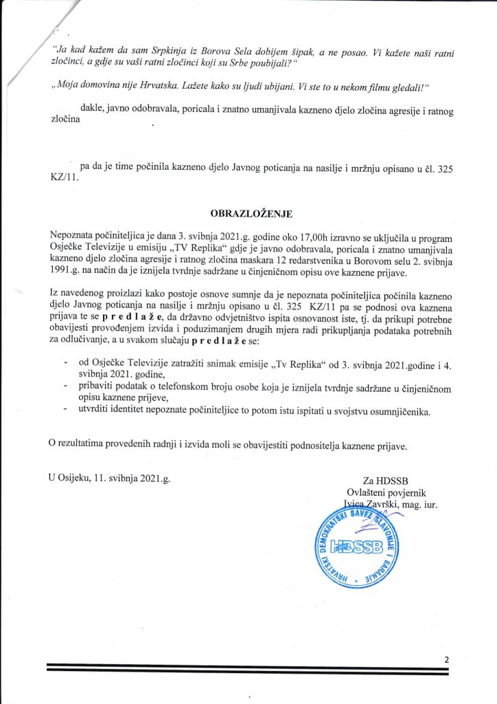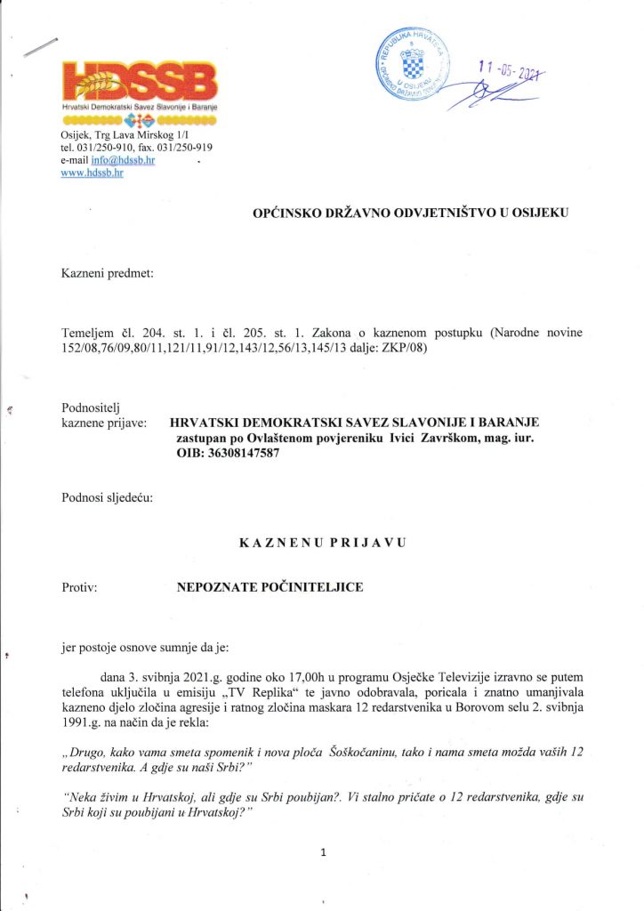 Kako tvrde u kaznenoj prijavi, dana 3. svibnja 2021. godine oko 17 sati u programu Osječke Televizije navodna počiniteljica se izravno putem telefona uključila u emisiju TV Replika te javno odobravala, poricala i znatno umanjivala kazneno djelo zločina agresije i ratnog zločina maskara 12 redarstvenika u Borovom selu 2. svibnja 1991. Godine.