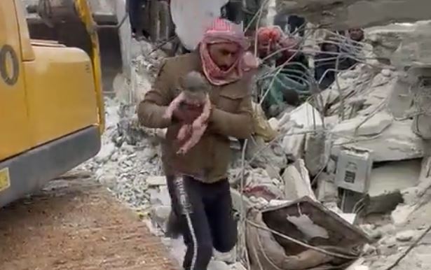 Na videosnimci koja kruži društvenim mrežama može se vidjeti kako muškarac usred ruševina podiže dijete u rukama potpuno golo, prašnjavo i s pupkovinom koja visi. Spasioci su odmah umotali dijete jer je temperatura bila oko ništice i prevezli ga u bolnicu u obližnjem Afrinu.