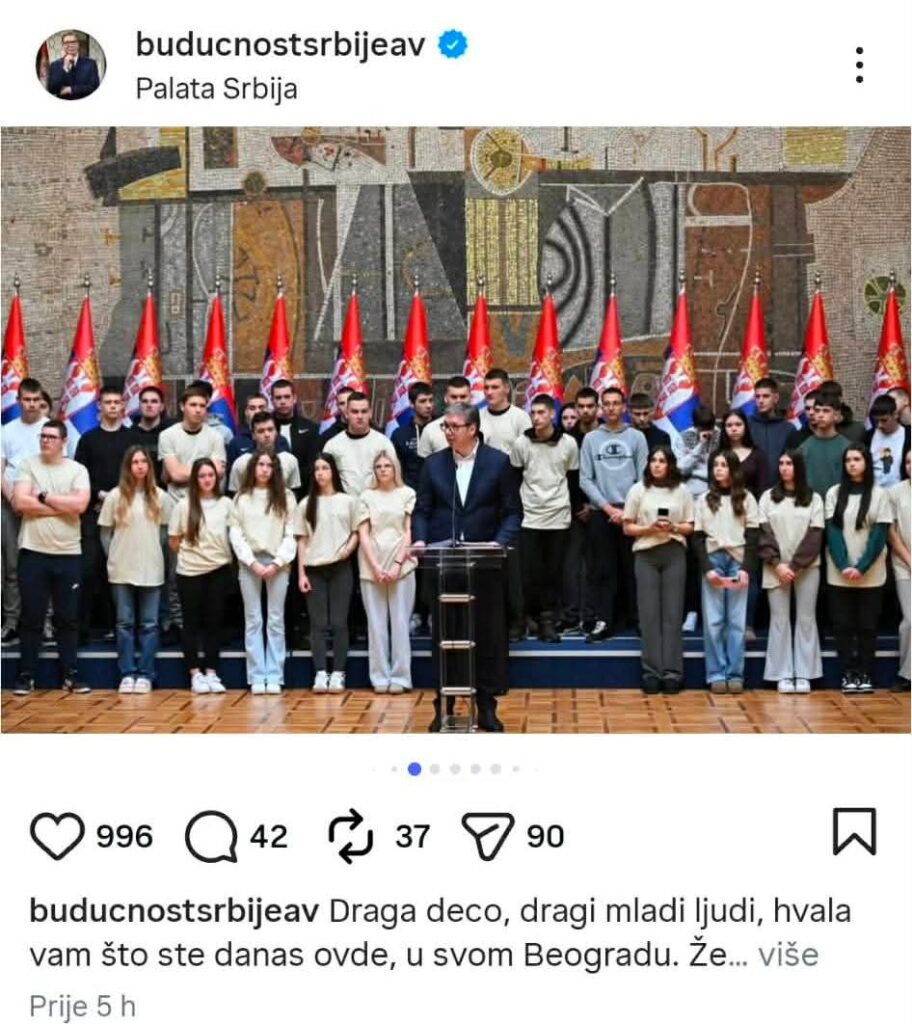 Vučić je na društvenim mrežama objavio opširnu poruku uz zajedničke fotografije s učenicima iz Vukovara, u kojoj je, među ostalim, naveo: