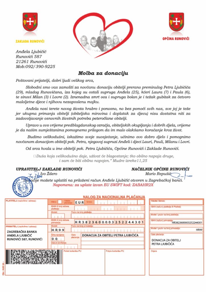 Upravo u ovo vrijeme predblagdanskog ozračja, obiteljskih okupljanja i dobrih djela, vrijeme je da našim sumještanima pomognemo prilogom da im malo olakšamo koračanje kroz život. Budimo velikodušni, iskažimo svoje suosjećanje, učinimo ovo dobro djelo i pomozimo novčanom donacijom obitelji – piše u apelu koji potpisuju i Općina Runovići te Zaklada Runovići.