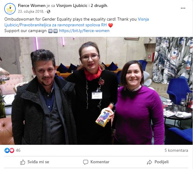 Putem tvrtke Fierce Women udruga K-zona izdala je istoimenu društvenu igru kojom se navodno promoviraju žene koje su značajno doprinijele društvu. Društvenu igru koja “promovira žene” promovirala je upravo pravobraniteljica za ravnopravnost spolova Višnja Ljubičić i to zajedno s Noahom Kraljevićem, koji je od ženskog spola odustao, a svoju su suradnju ovjekovječili i zajedničkom fotografijom.
