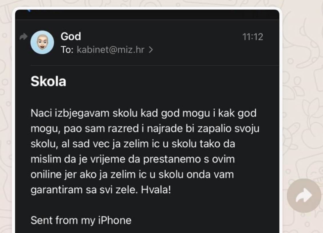 – Izbjegavam školu kad god mogu i kak god mogu, pao sam razred i najradje bi zapalio svoju školu, al sad već ja želim ić u školu tako da mislim da je vrijeme da prestanemo s ovim online jer ako ja želim ić u školu onda vam garantiram da svi žele. Hvala! – napisao je učenik.