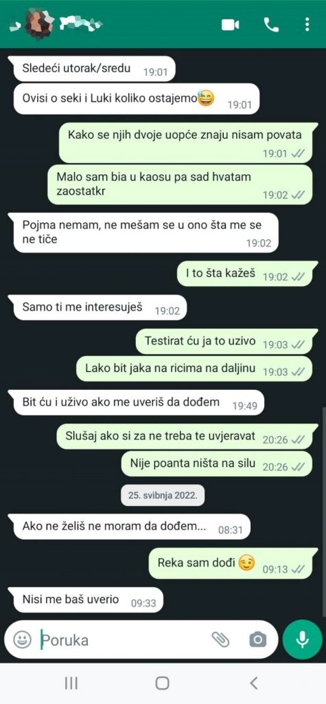 U jednoj od poruka koje Baričić šalje Aleksandri piše “ajd slušaj, jel želiš da ti Bojan izjebe seku” te joj govori da mu kažu da joj sestra ima 18 godina. “Molim te reci sestri da je on sada kandidat na izborima, ali da je svakako želi”, piše Baričić koji je u razgovoru za Večernji list rekao da se radi o navlakuši na koju su on i Ivošević naivno pali.