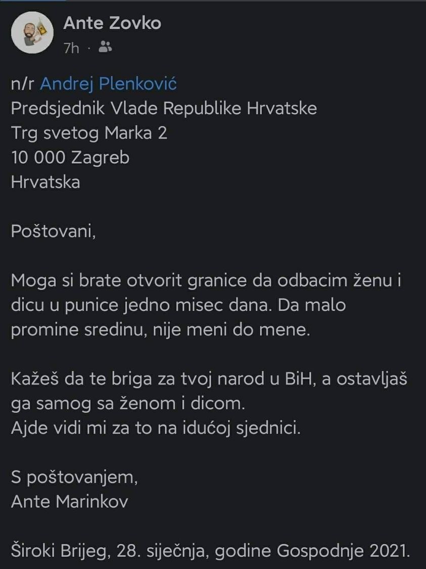 “Poštovani, Moga si brate otvorit granice da odbacim ženu i dicu u punice jedno misec dana. Da malo promine sredinu, nije meni do mene. Kažeš da te briga za tvoj narod u BiH, a ostavljaš ga samog sa ženom i dicom. Ajde vidi mi za to na idućoj sjednici”, stoji u poruci koju je potpisao stanoviti Ante Zovko, odnosno Ante Marinkov.