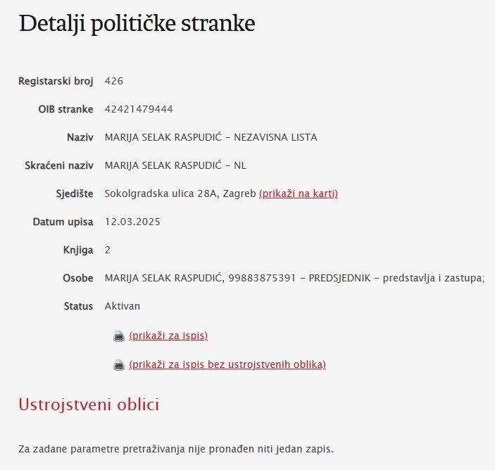 Podsjećamo da je nakon raskola u Mostu Marija Selak Raspudić zajedno s mužem Ninom napustila Most i 13.ožujka 2025. osnovala stranku koju je nazvala “Marija Selak Raspudić -nezavisna lista”. Paradoksalno je da se na izborima za gradonačelnicu Zagreba predstavljala kao nezavisna kandidatkinja.