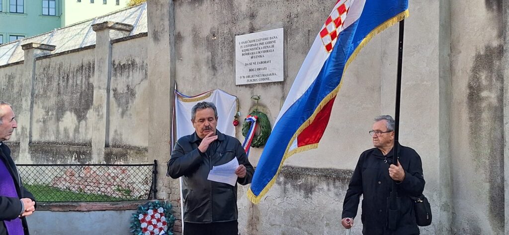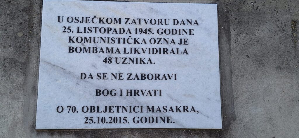 Kod Spomen ploče na zidu osječkog Okružnog zatvora u Neumanovoj ulici, danas je polaganjem vijenaca, paljenjem svijeća i molitvom obilježena 80. obljetnica stradanja 48 osoba zatočenih i ubijenih 1945. godine u tadašnjem Vojnom zatvoru. Bio je to jedan od najtežih poslijeratnih zločina komunističkog režima na području Slavonije.