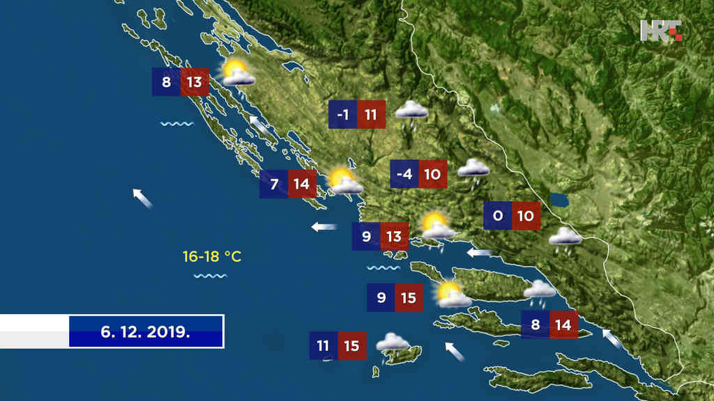 Kiše će biti i mjestimice u Dalmaciji, gdje će također biti oblačnije nego tijekom četvrtka. Zbog toga jutro biti toplije, a dnevna temperatura podjednaka – većinom između 10 i 15 °C. Puhat će najprije bura, koja će okrenuti na istočni i jugoistočni vjetar uz malo do umjereno valovito more.